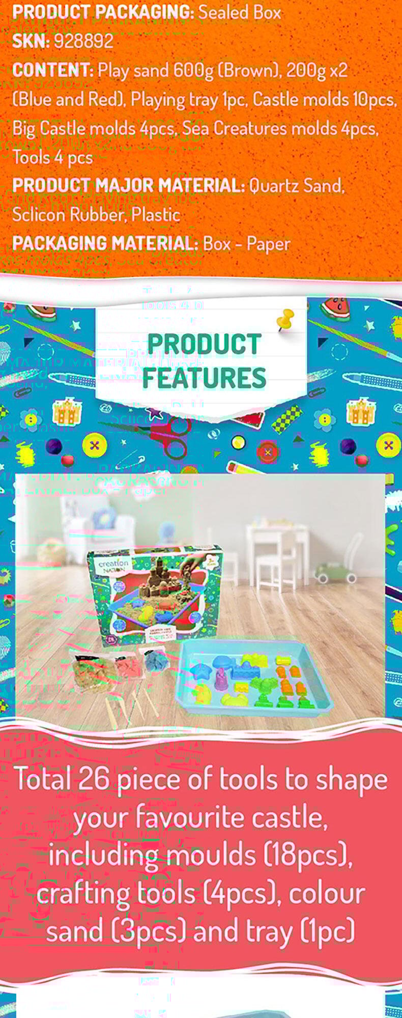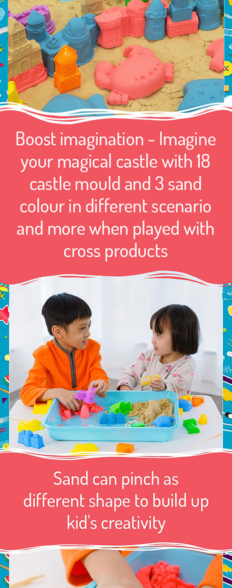 My Creation Sand Castle will be completed soon! This Set unlocks a child’s limitless imagination and encouraging creative play. Young builders enjoy moulding the magnificent pink towers constructed with blue keeps and grey curtain walls with the non-sticky, safe-to-play Sand. They are more than happy to tell you every stories behind their creation!