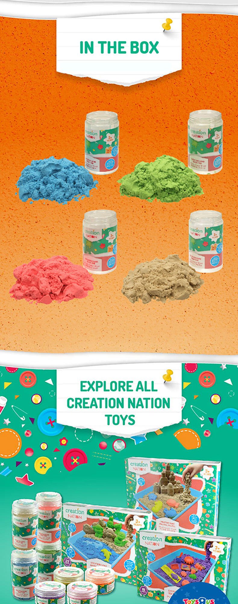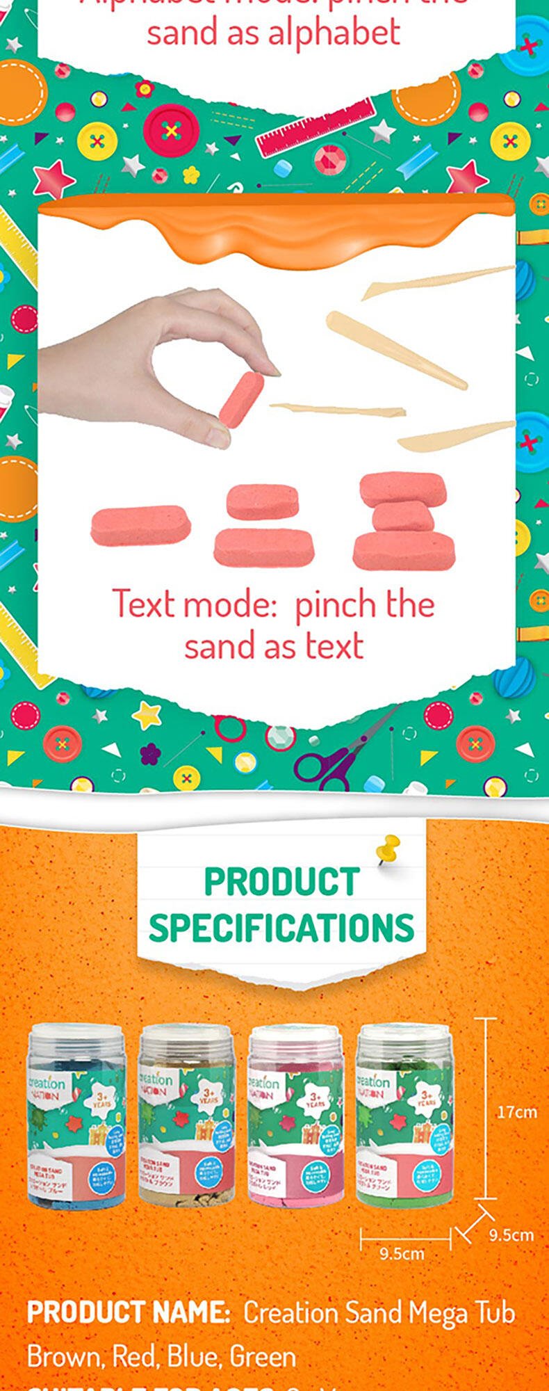 Squish, squash, squeeze! Playing with this magical, sensory-integrated Creation Sand anywhere is the new normal! It's so relaxing when this non-wet, pliable and clean Sand seeps smoothly through your fingers. And it's even more satisfying when you seize and shape the Sand to mould your multi-coloured dreamland with endless possibilities.