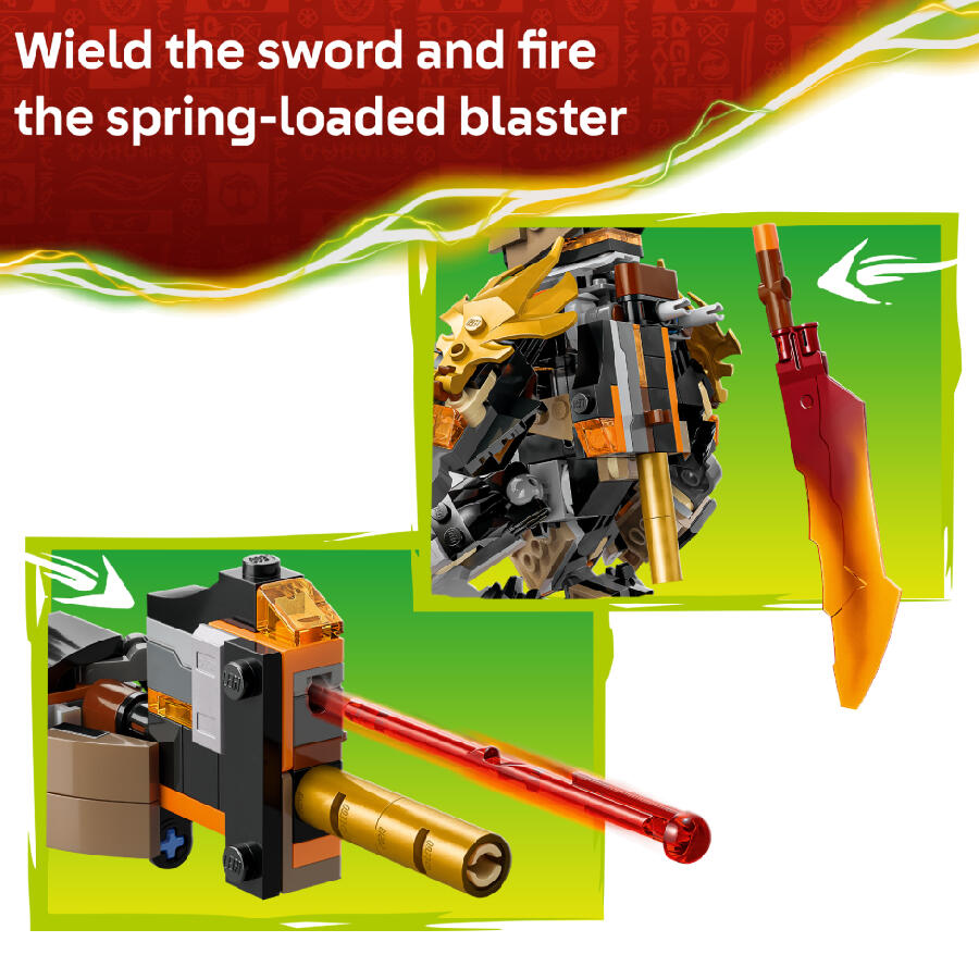 Recreate action from season 4 of the NINJAGO Dragons Rising TV show with the LEGO NINJAGO Cole’s Mission Mech & Dragon Zane ninja toy.