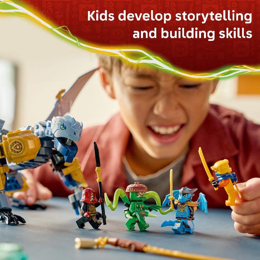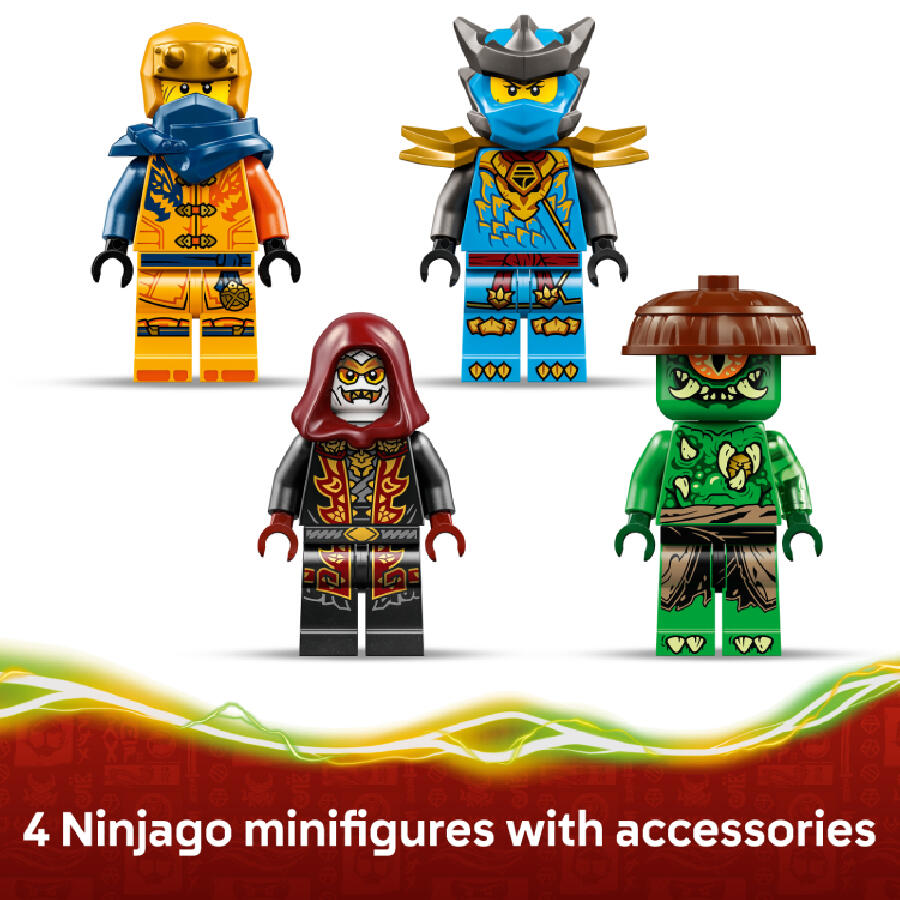 Recreate action from season 4 of the NINJAGO Dragons Rising TV show with the LEGO NINJAGO Ninja Dragon Riyu’s Battle playset with 4 minifigures.