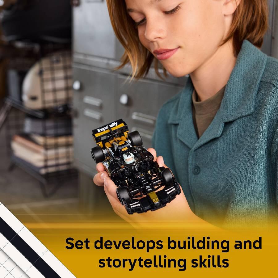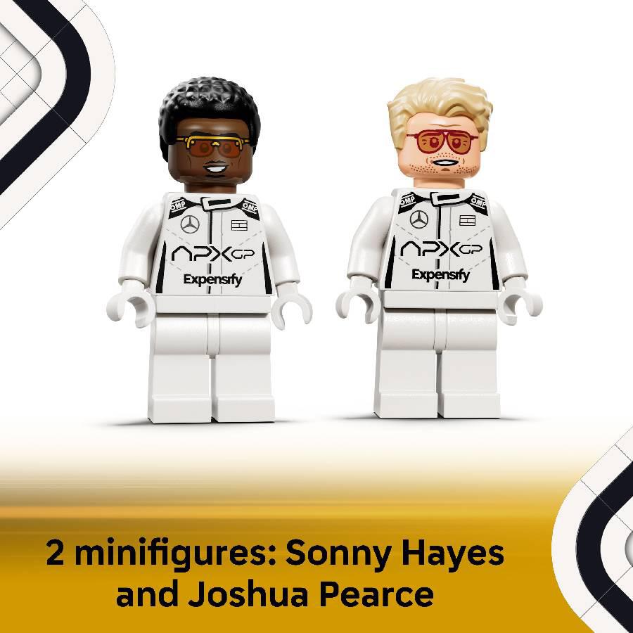 - 2 F1 DRIVER MINIFIGURES – Race car model kit with 2 minifigure characters from F1 The Movie: Sonny Hayes and Joshua Pearce, who both come with helmets featuring their signatures.