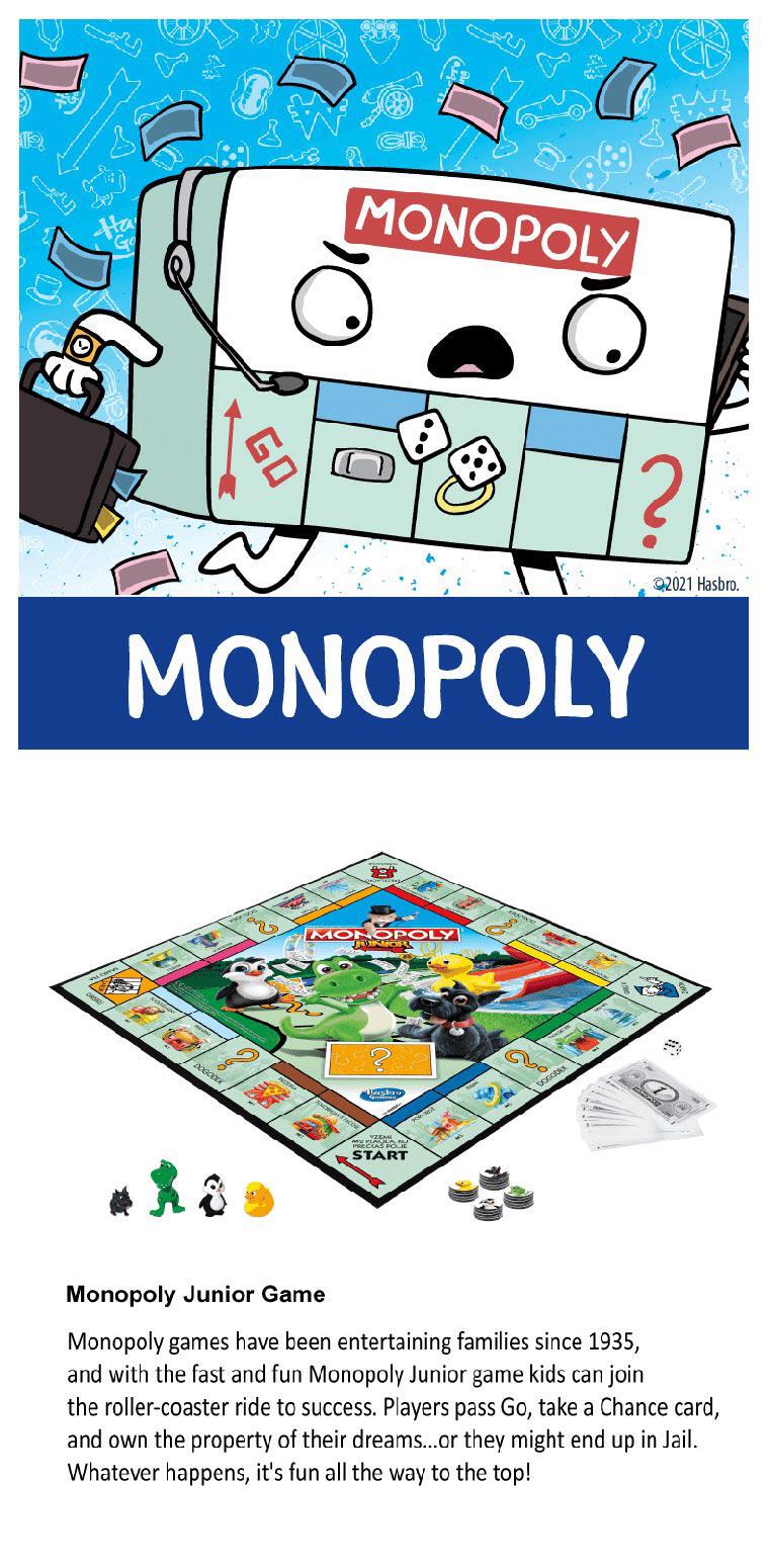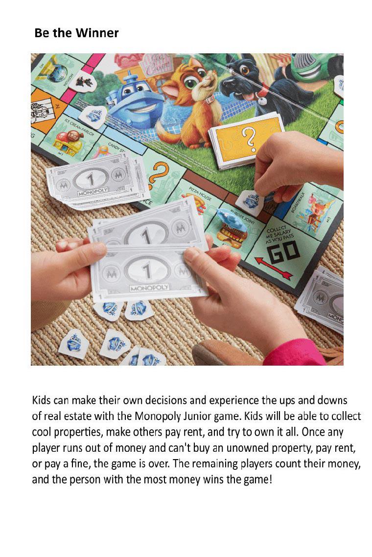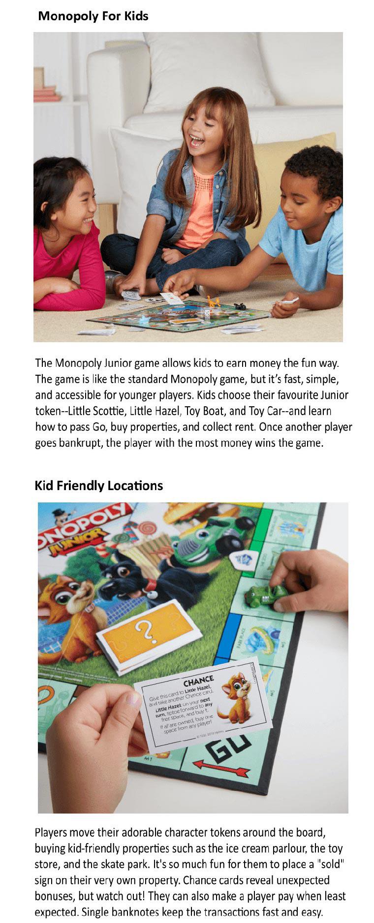• Fast-trading Monopoly Junior game is for younger players• Game is like the classic Monopoly game but easier for kids