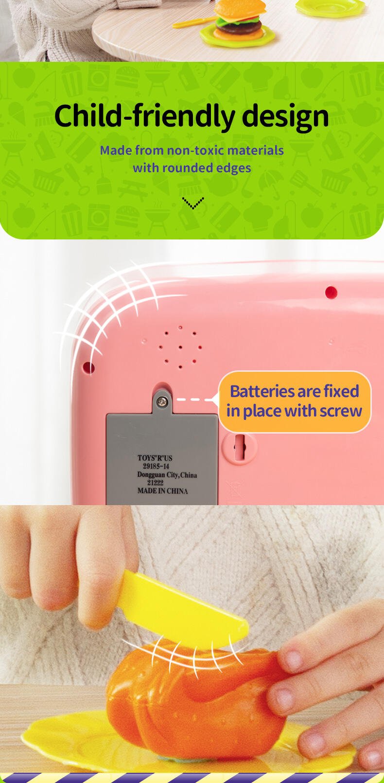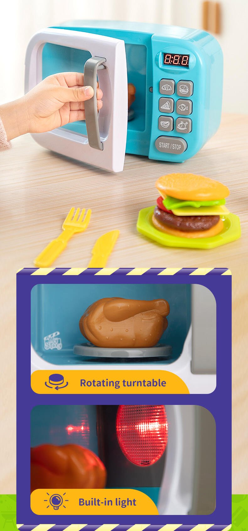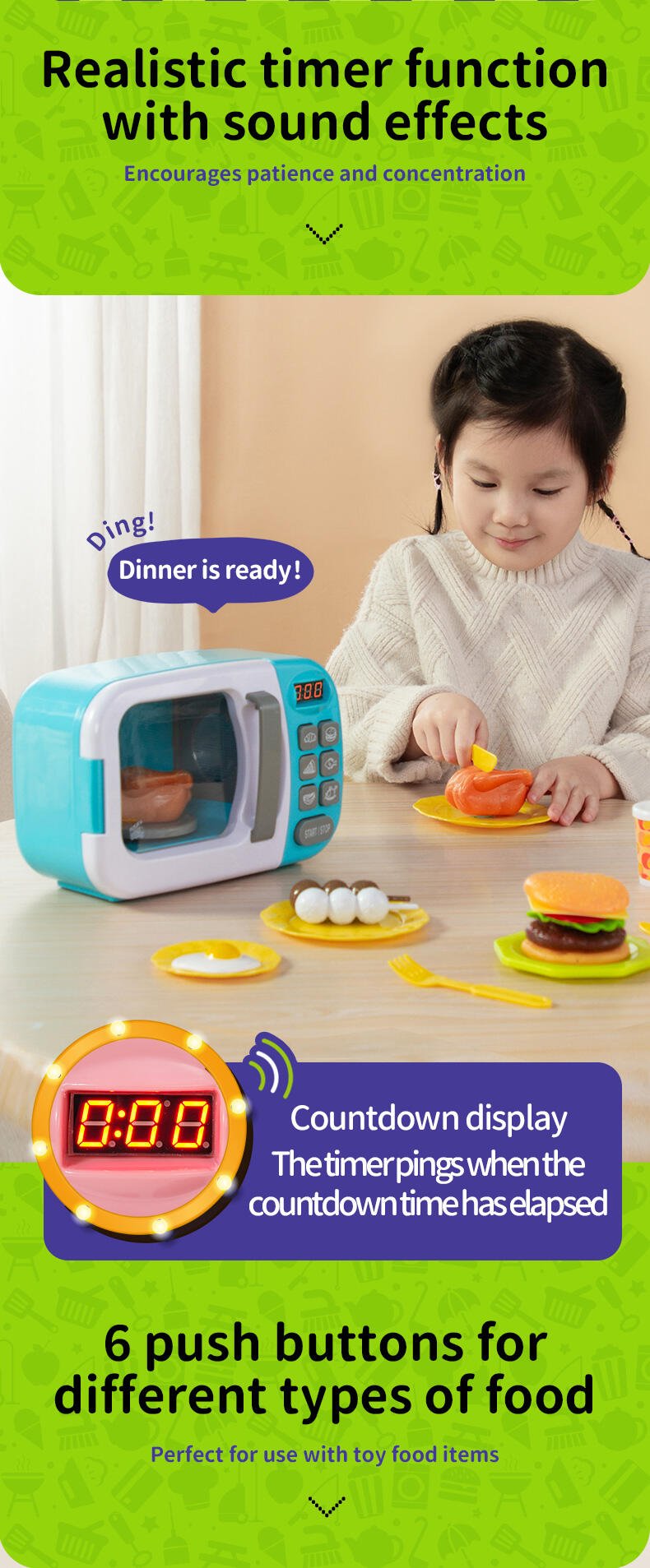 • Interactive microwave with realistic lights, sounds & movement
