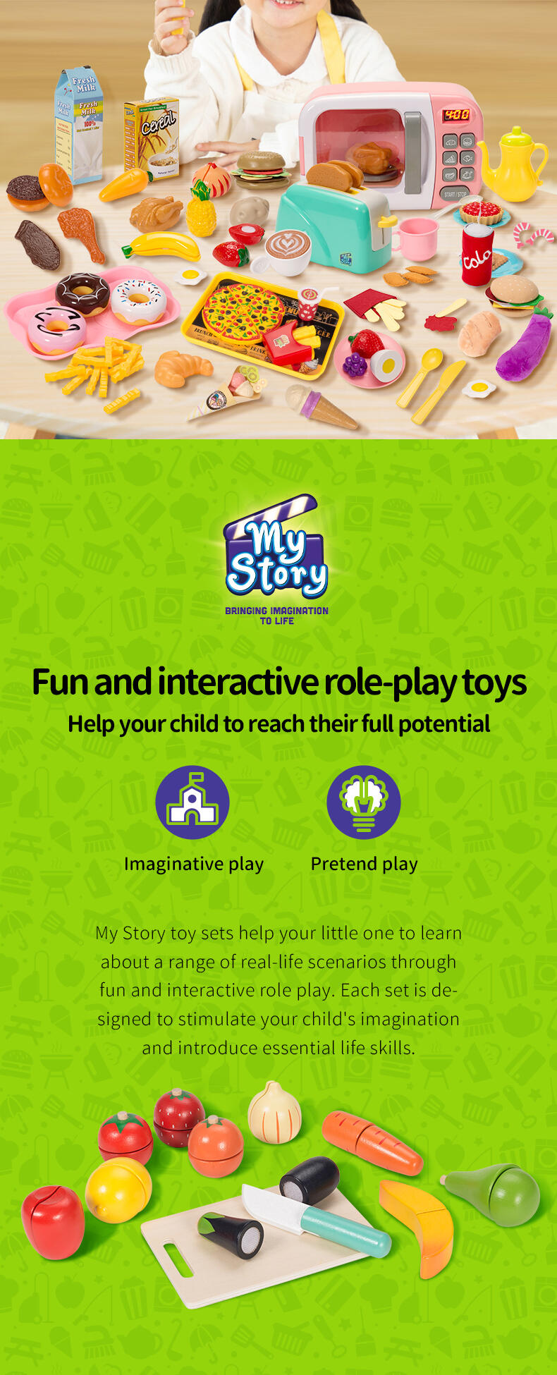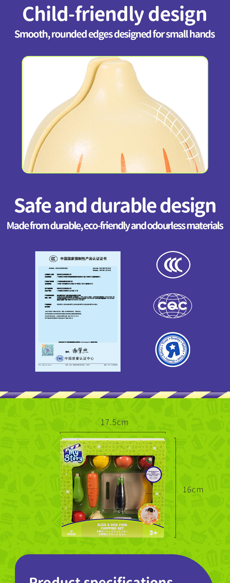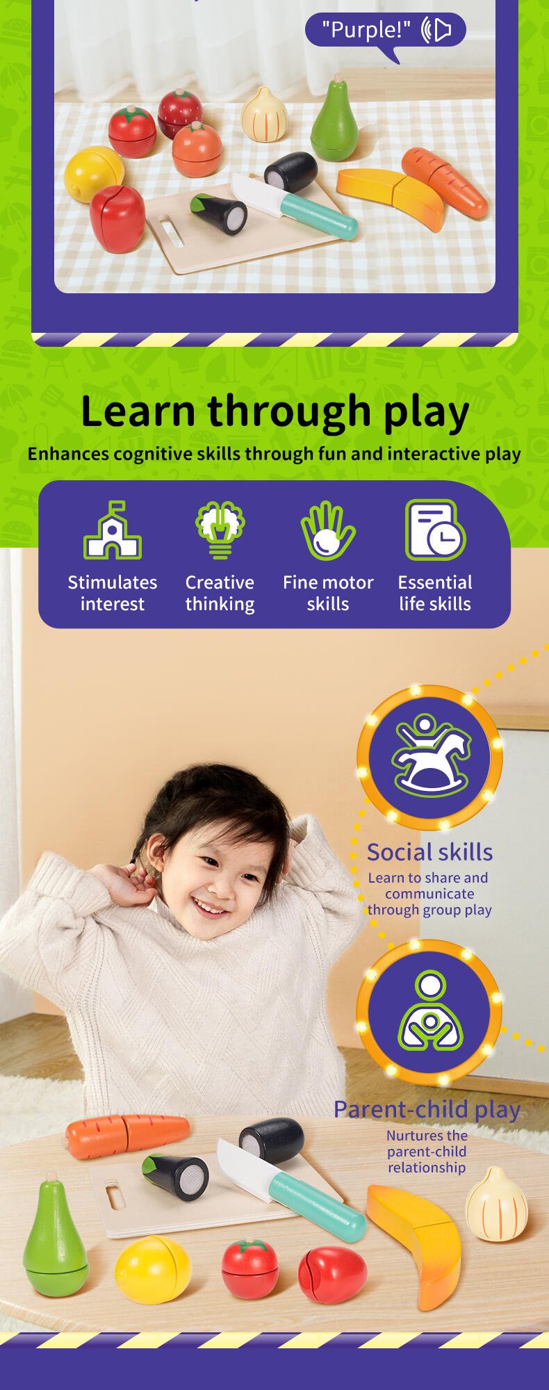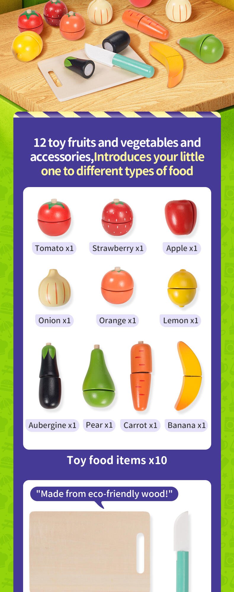 Kids will love the opportunity to be in charge of chopping and prepping their own snacks and meals. Each fruit and vegetable is connected with velcro and little ones use the wooden knife to cut the food into segments. The smooth, round edges of the food items and knife will ensure that playtime is totally safe and comfortable for little hands. This activity will encourage coordination and motor skill development, as well as introducing colour and shape cognition, and highlighting delicious and healthy food choices in a safe and comfortable environment.