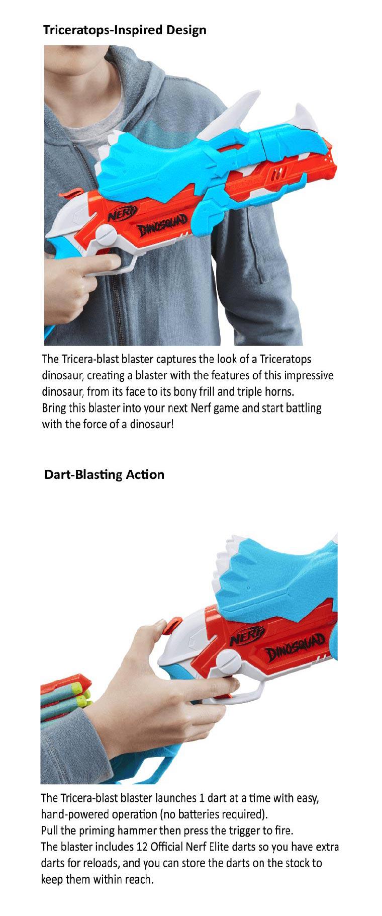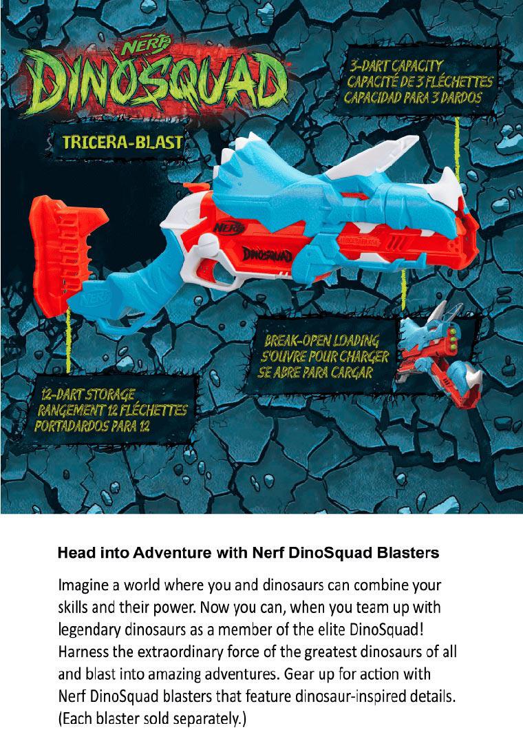 - NERF Dinosquad Tricera-Blast Blaster: Charge Into Triple-Dart Action With This Blaster That Features Awesome Dinosaur Details, Capturing The Look Of A Triceratops Dinosaur