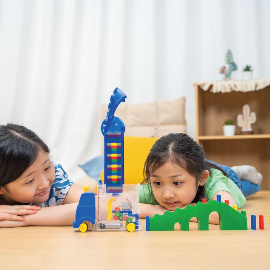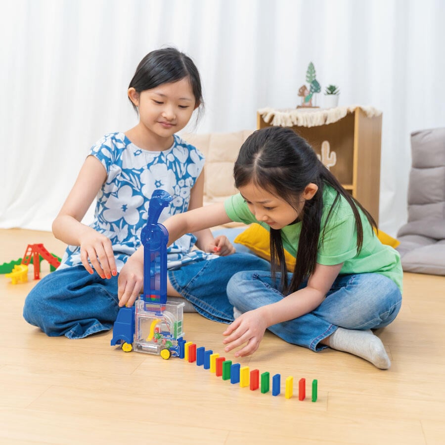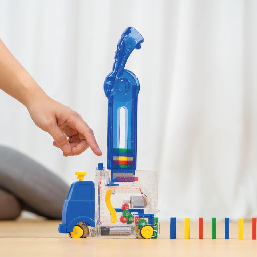 Build your own domino design using the special, automated construction lorry. Insert pieces into the lorry one at a time and they are distributed automatically in a perfectly curved or straight line. Build your own imaginative domino world using the hundreds of colourful pieces.