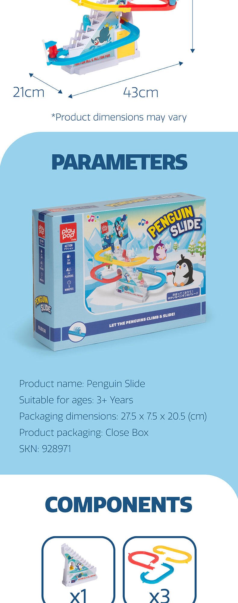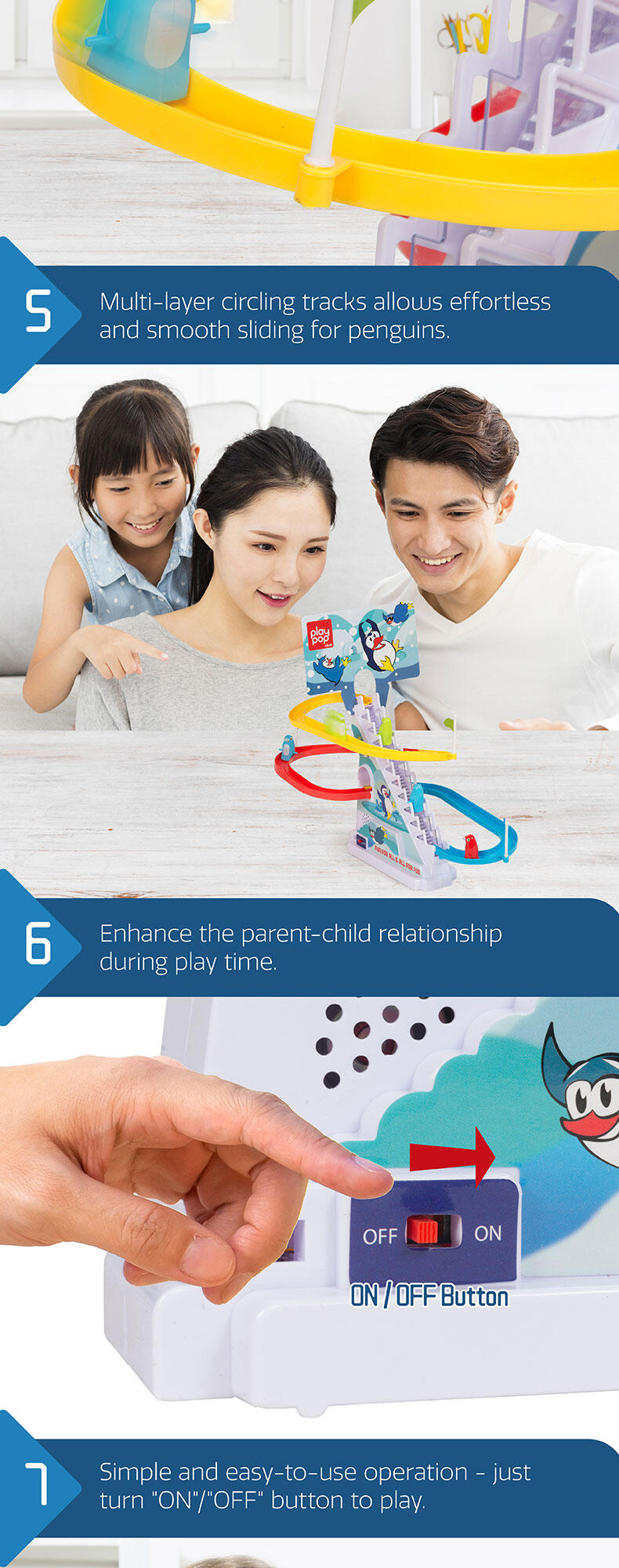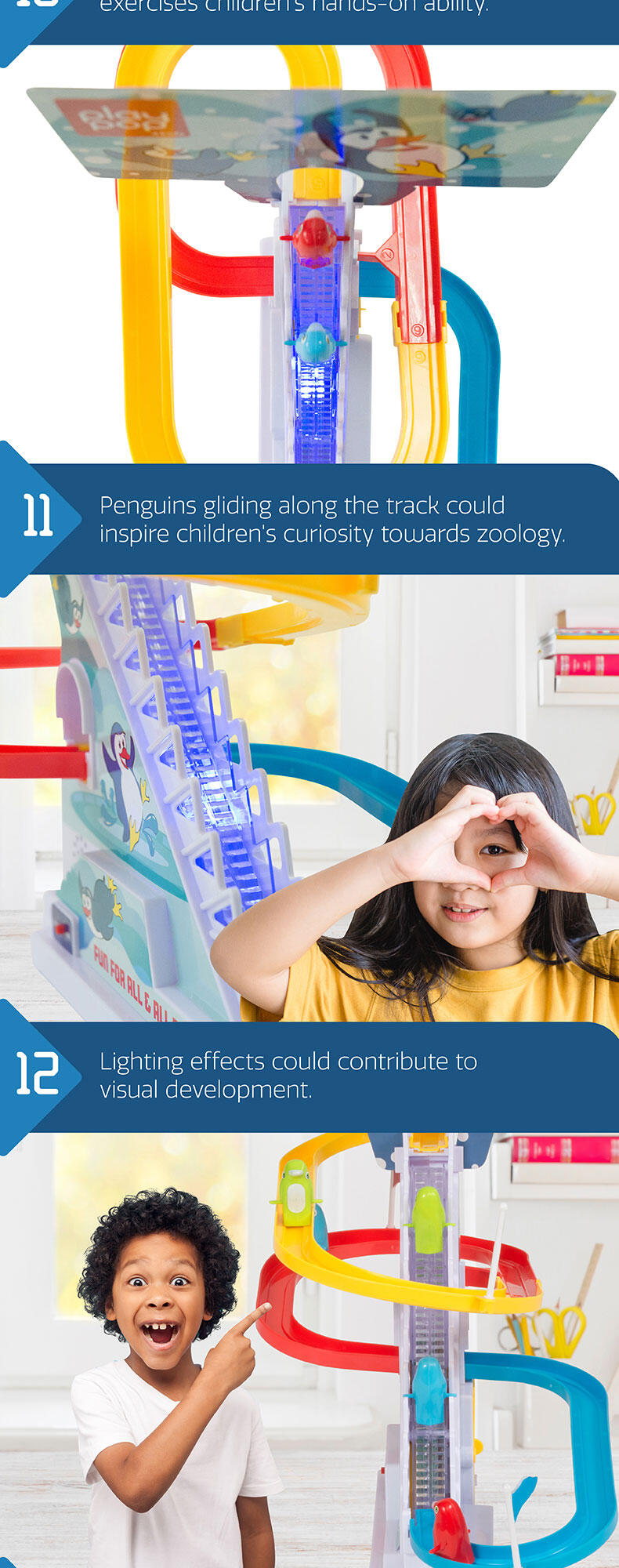 Watch the penguins climb up the steps and then happily race down the colourful slide to reach the bottom of the steps. It’s super entertaining. The adorable penguins try to keep up with each other but always find themselves seconds behind. Together with the joyful music, children cheer for the penguins wholeheartedly.