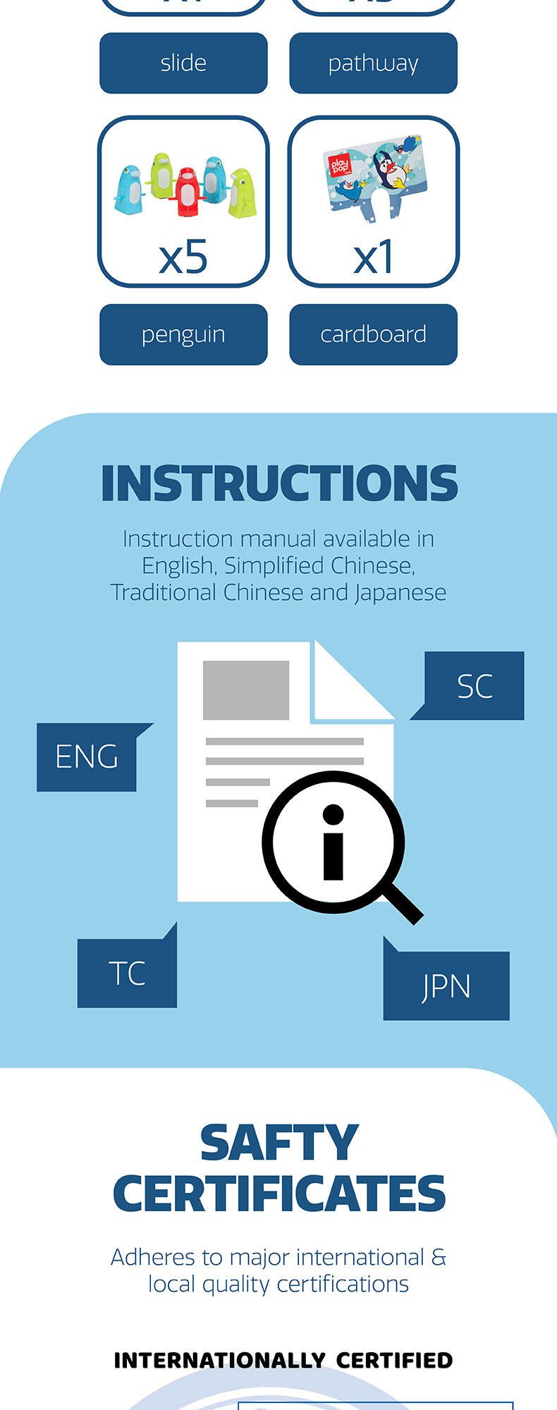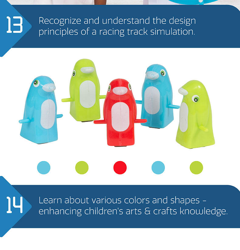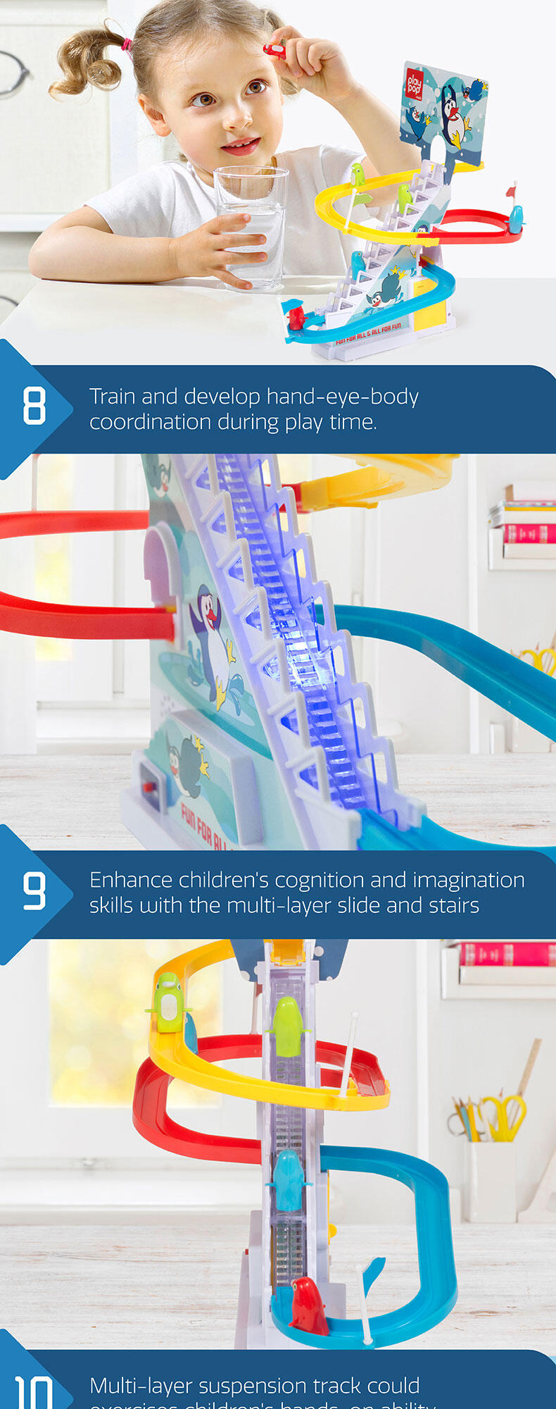 Watch the penguins climb up the steps and then happily race down the colourful slide to reach the bottom of the steps. It’s super entertaining. The adorable penguins try to keep up with each other but always find themselves seconds behind. Together with the joyful music, children cheer for the penguins wholeheartedly.