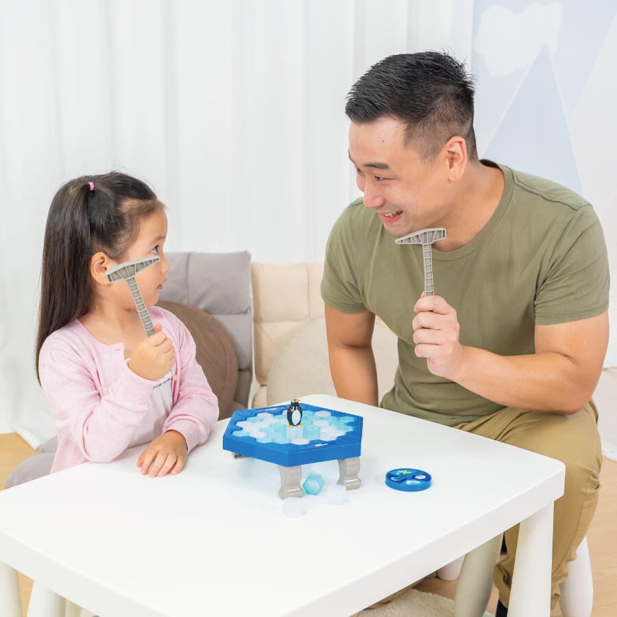 Arrange the ice blocks in the tray and place the penguin in the centre. Taking turns, each player knocks down an ice block using the special picks and directed by the arrows. The aim is to keep the little penguin safe on the ice. Whoever causes the penguin to fall off the ice loses, with a winner determined by the player with the most ice blocks.