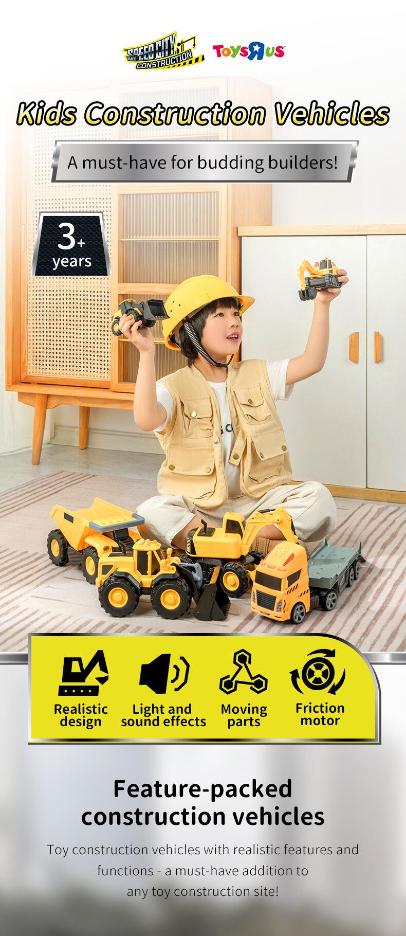 The realistic functions of the Power Mover Wheel Loader will make little construction workers feel like they’re running their very own building site. The motorised bucket arm can be raised and lowered, and the truck drives forward and back at the push of a button. Realistic lights and sounds create an authentic experience that encourages kids to explore the world around them through play and storytelling. Perfectly proportioned for ‘push-along’ play, this vehicle will help develop cognitive, creative and essential motor skills.