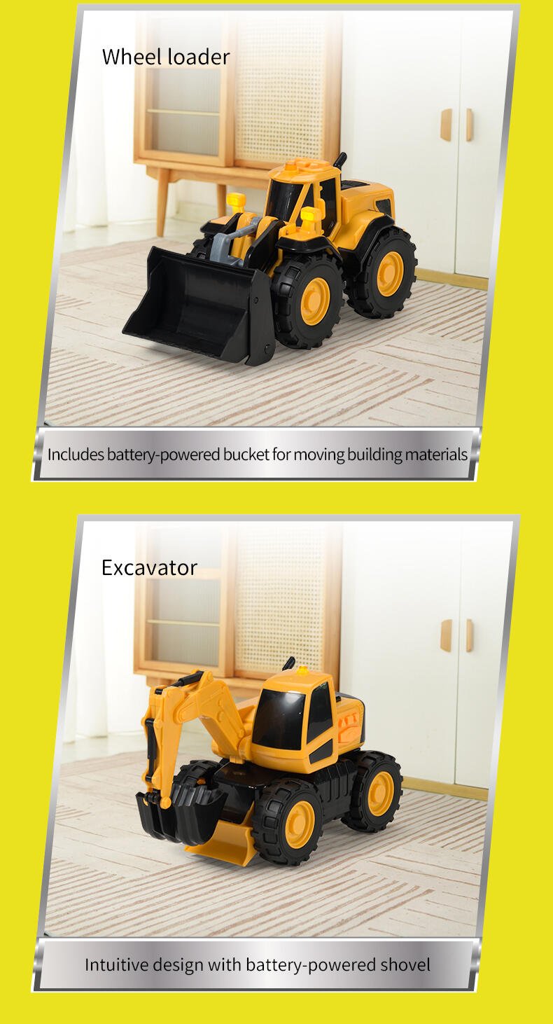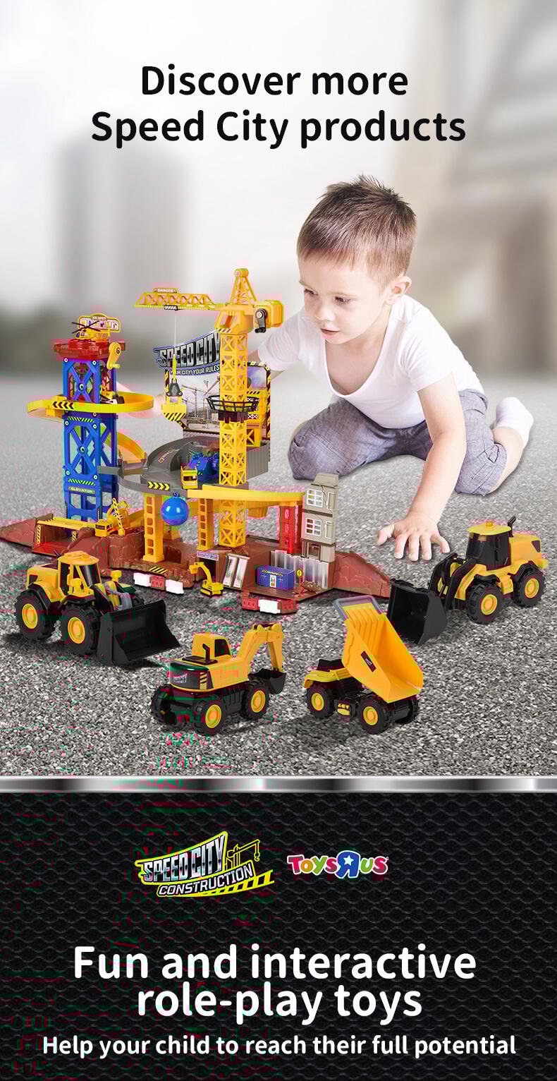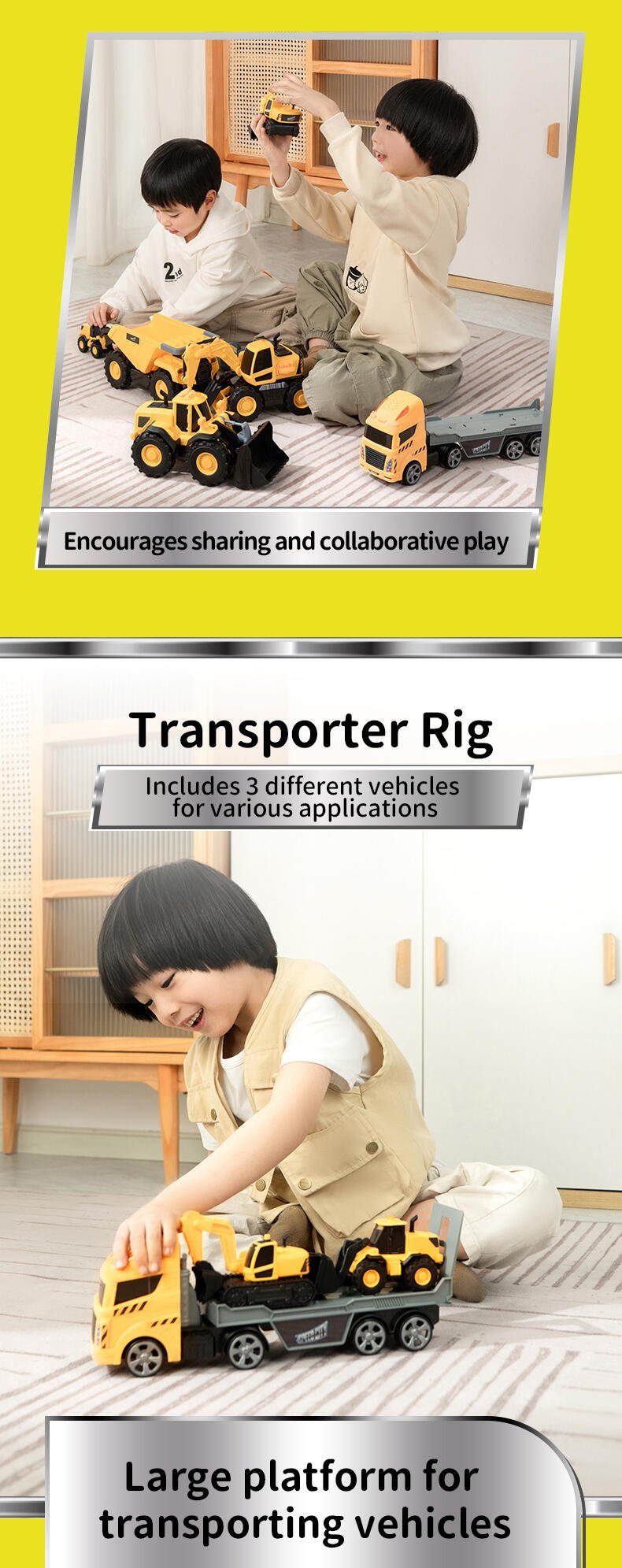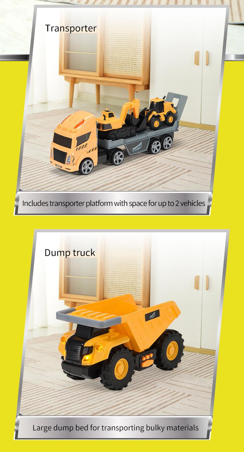 When it comes to heavy equipment, you need a powerful vehicle to get around. The Flashing Construction Transporter can carry your excavator and loader with ease as you make your way from one site to the next - just drive up the ramp and you’re ready to go! The realistic flashing lights and engine sounds create an authentic play experience, while the excavator and loader feature manually operated front buckets. Each of the vehicles are the perfect size for ‘push along’ play and this set will help inspire kids to explore and learn about the world around them.