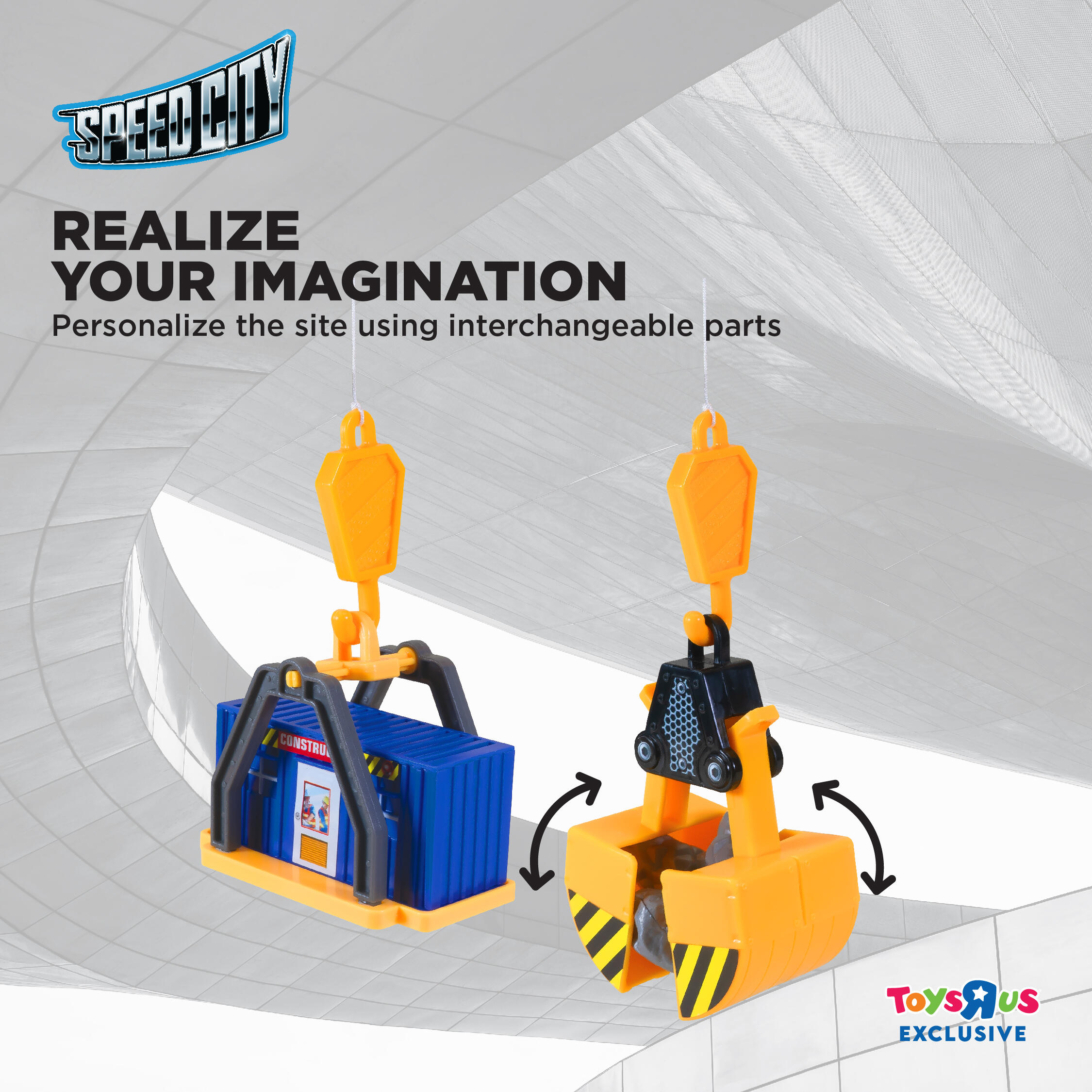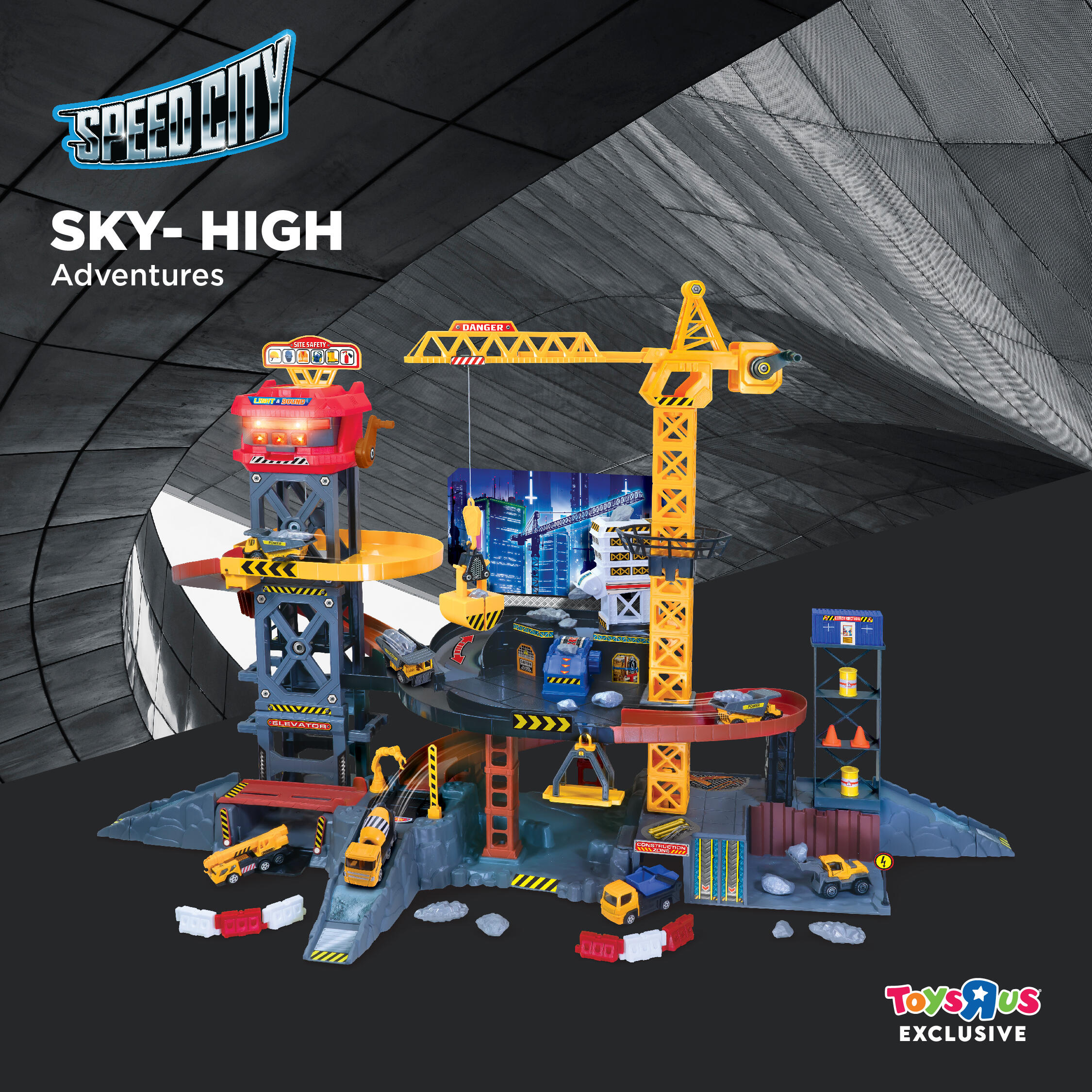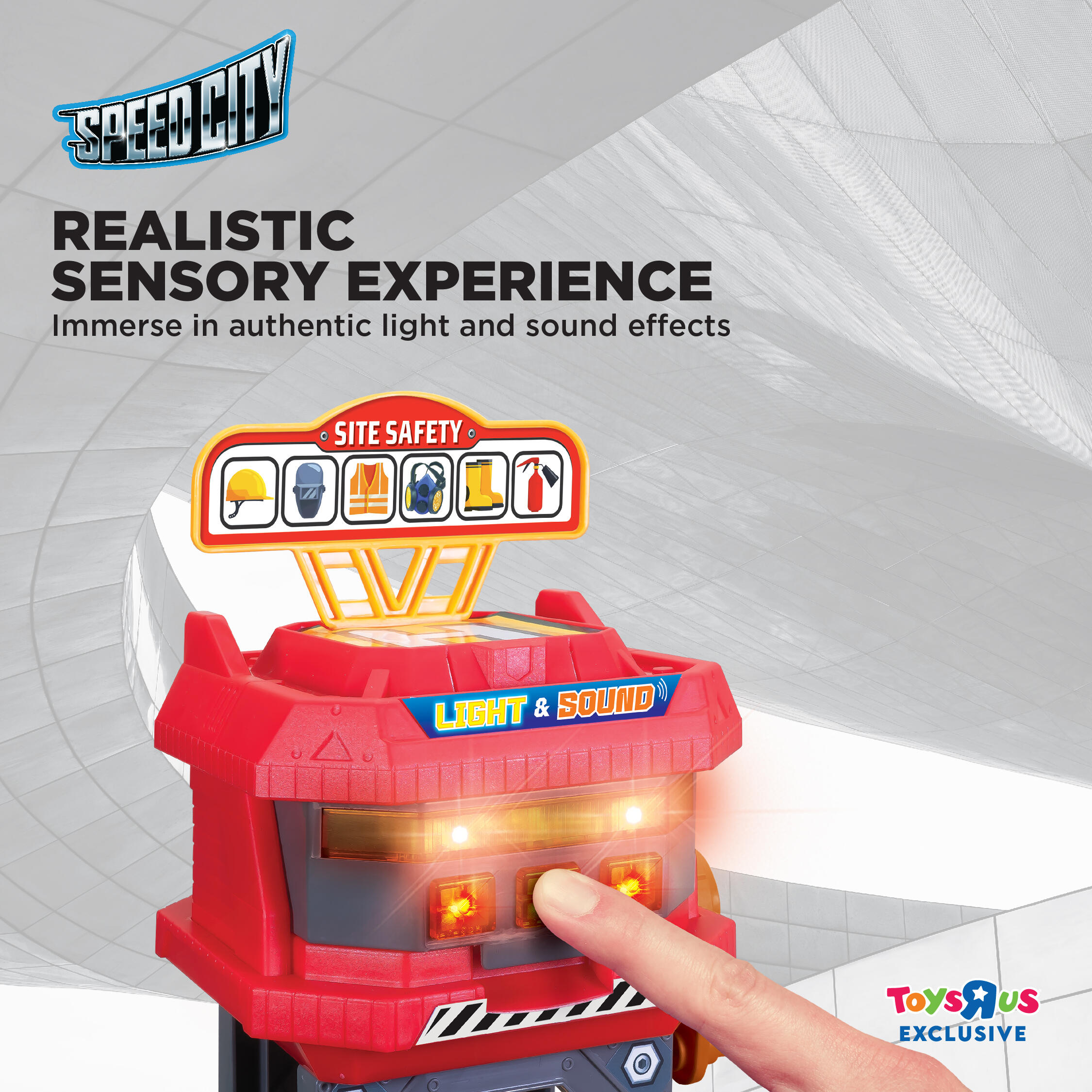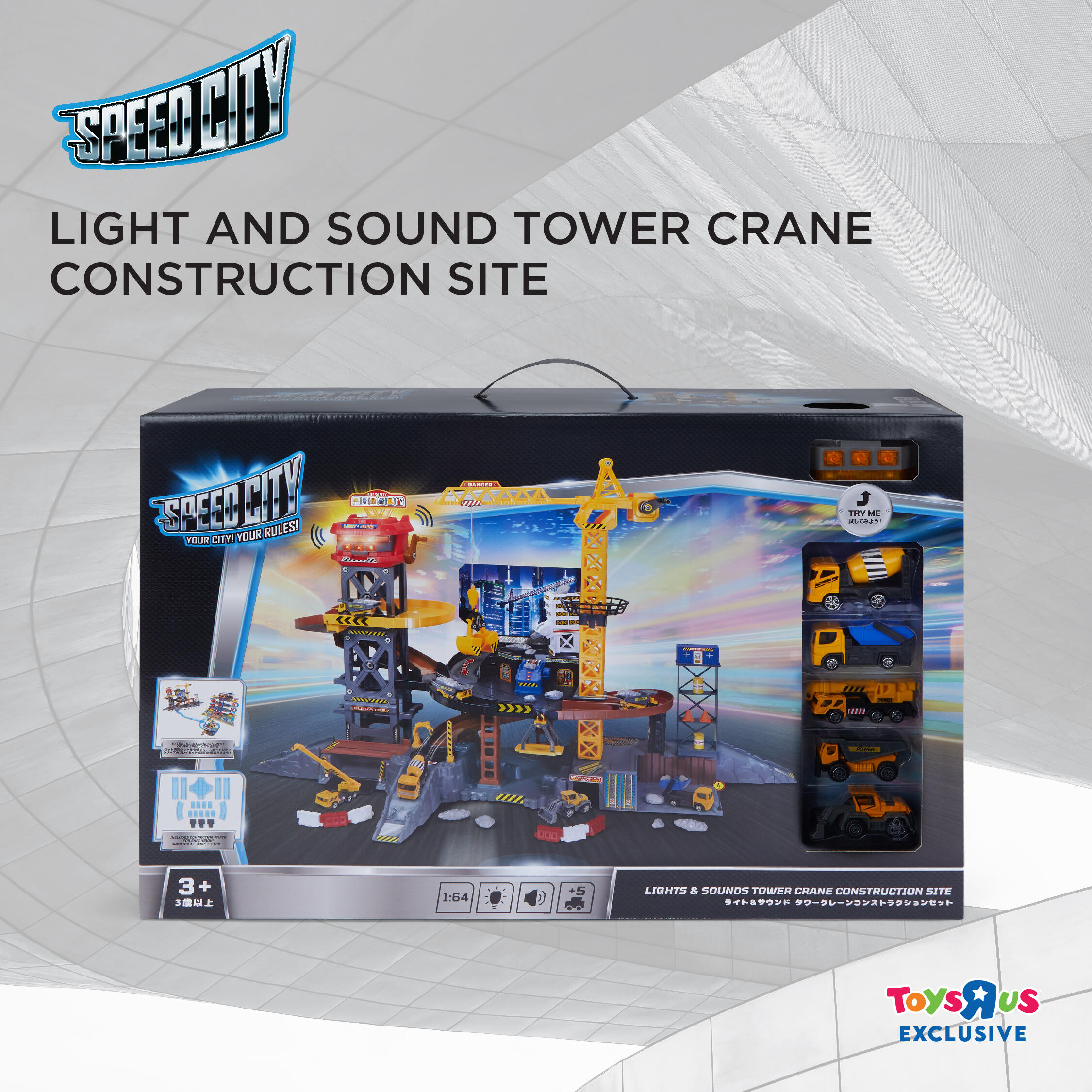Lights & Sounds Tower Crane Construction Site includes 5 die-cast construction vehicles. Realistic construction site has various scenes to play with.