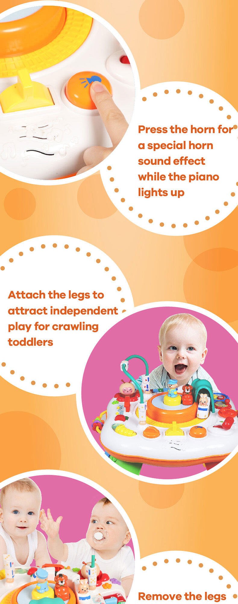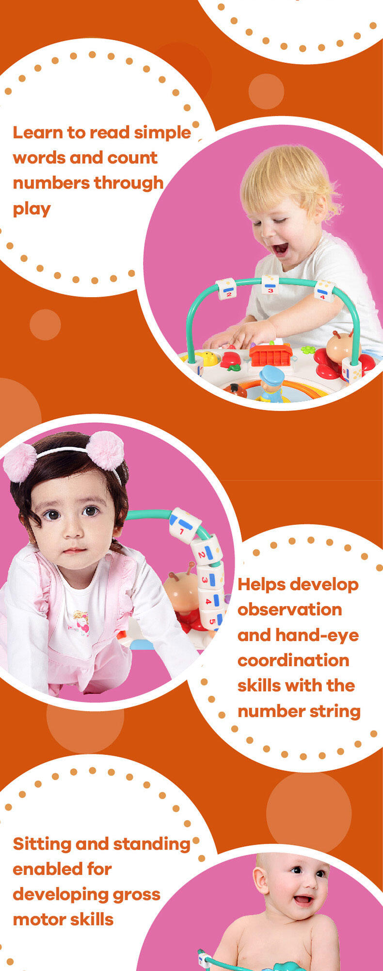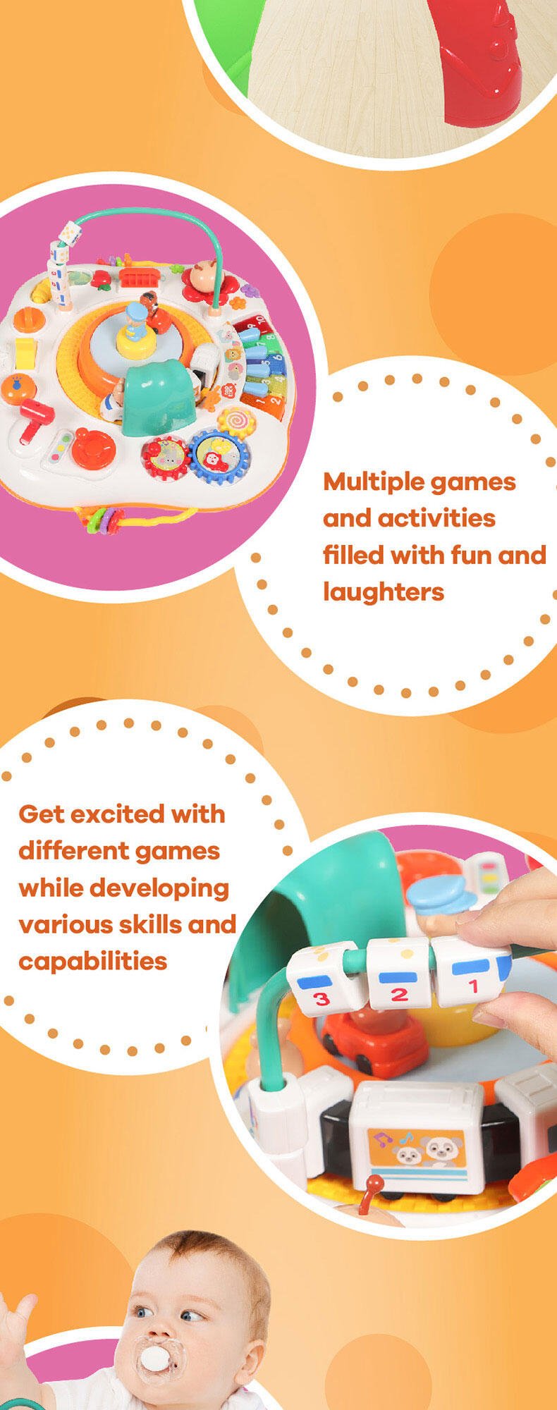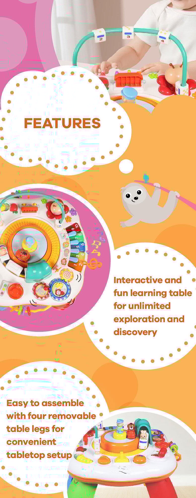 This unique learning table is an immersive and fully interactive play experience that grows with your baby. It transitions from the floor to standing, with sturdy legs that can be assembled or removed as needed. Different modes and sounds help develop language and fine motor skills. Bright colours, recognisable shapes, as well as numbers and simple vocabulary will help your little one learn through play.