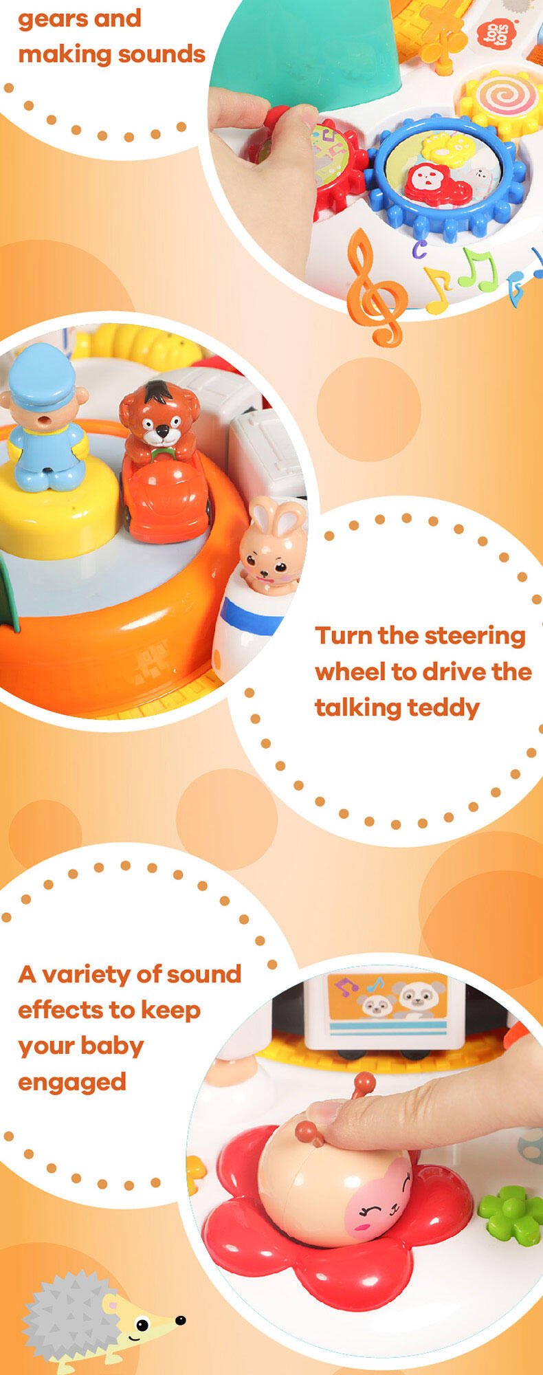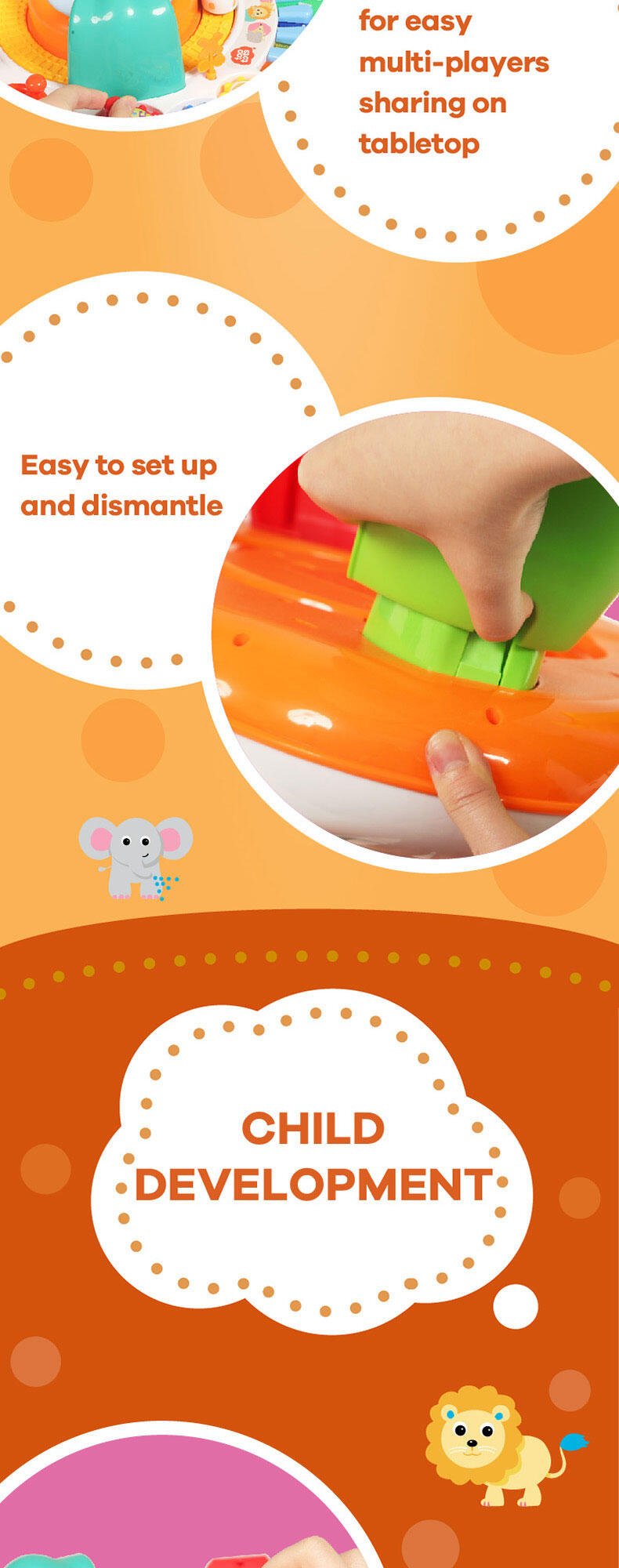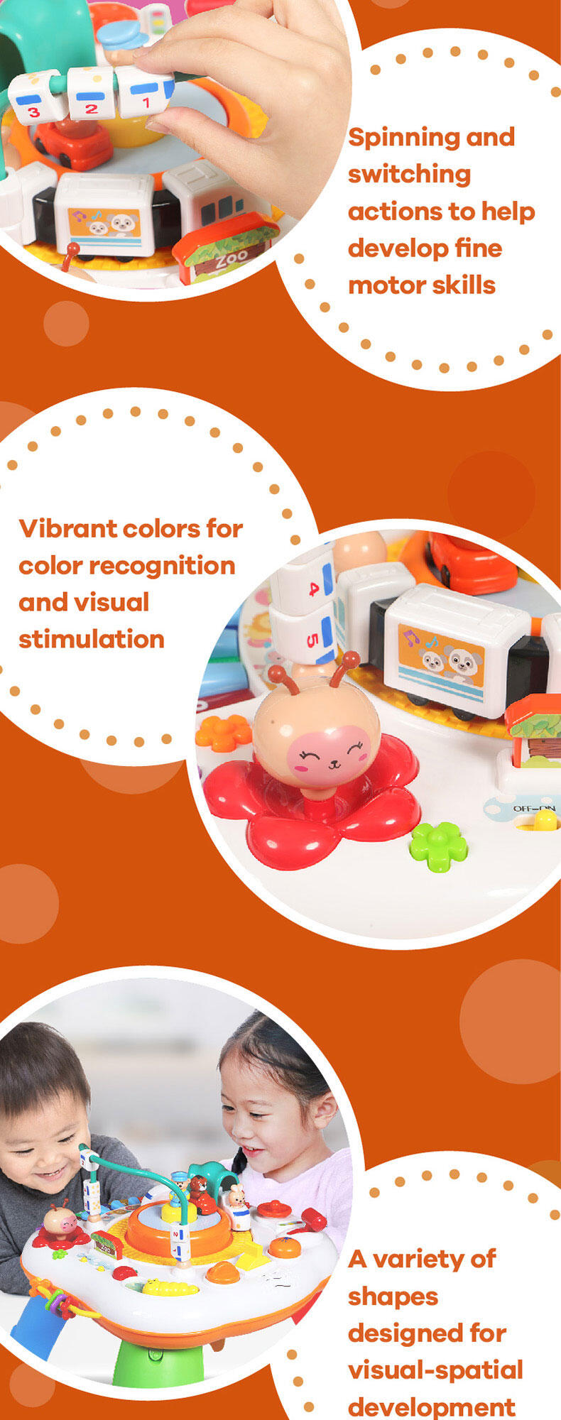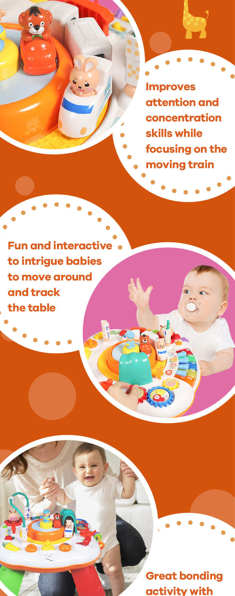 This unique learning table is an immersive and fully interactive play experience that grows with your baby. It transitions from the floor to standing, with sturdy legs that can be assembled or removed as needed. Different modes and sounds help develop language and fine motor skills. Bright colours, recognisable shapes, as well as numbers and simple vocabulary will help your little one learn through play.