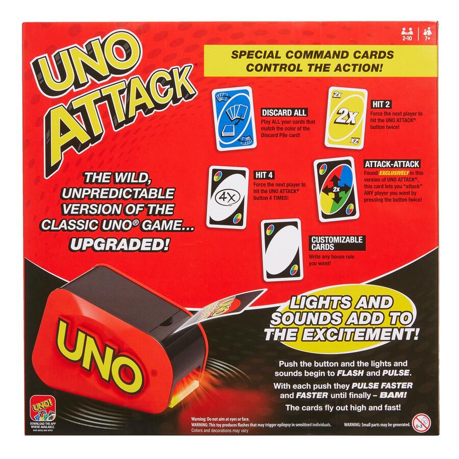 - This version of the UNO Attack game brings action, suspense and surprise with its sleek look, cool sounds and high-shooting cards. Lights and sounds build over time for extra excitement!